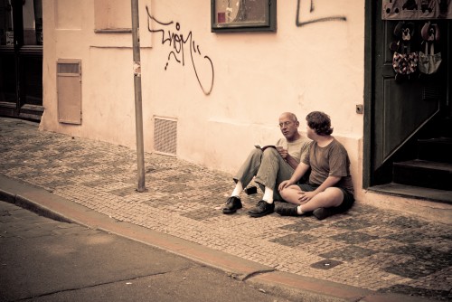 Upon one of my first of many non-directed wanderings through the streets of Prague, I came upon this scene of these two guys sitting on the sidewalk up against a building. They appeared to be looking at a travel guide probably because they found themselves lost in the winding, non-grid street system. I did this plenty of times after walking for a while after losing my sense of direction. A few times I would find myself in a sense of deja vu after coming upon the same streets because I walked in circles. Although I always tried to be discreet about my map review so I didn’t look too touristy. I’m sure my orange camera messenger bag helped me blend right in.